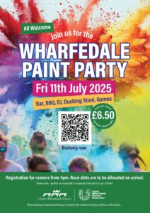 Join us for the Wharfedale Paint Party, a special outdoor fun event organised by Friends of Upper Wharfedale School, taking place on Friday 11th July 2025 from 4pm at UWS playing field. There will be a bar, BBQ, ducking stool, games and much more! Entry is £6.50 per runner, which includes a white T-shirt.